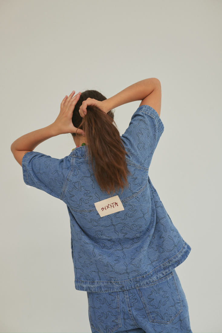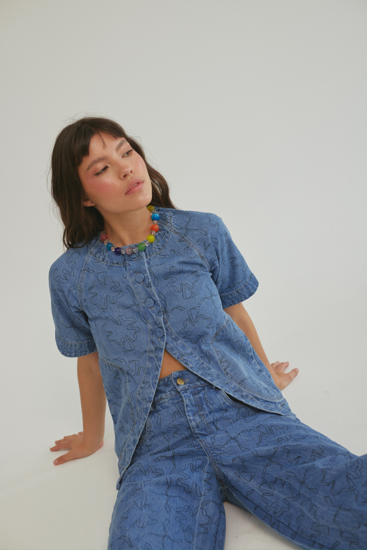 For our Fortune Top, we wanted to add an A-shaped opening at the front. We incorporated a romantic touch with its cap buttons and a more structured yet relaxed silhouette.