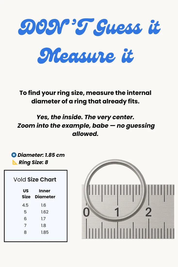 We recommend determining your size based on the internal diameter of a ring that fits you well. To find the internal diameter, refer to the following photo for guidance. The key here is to measure the INTERNAL DIAMETER of your ring, meaning the center.