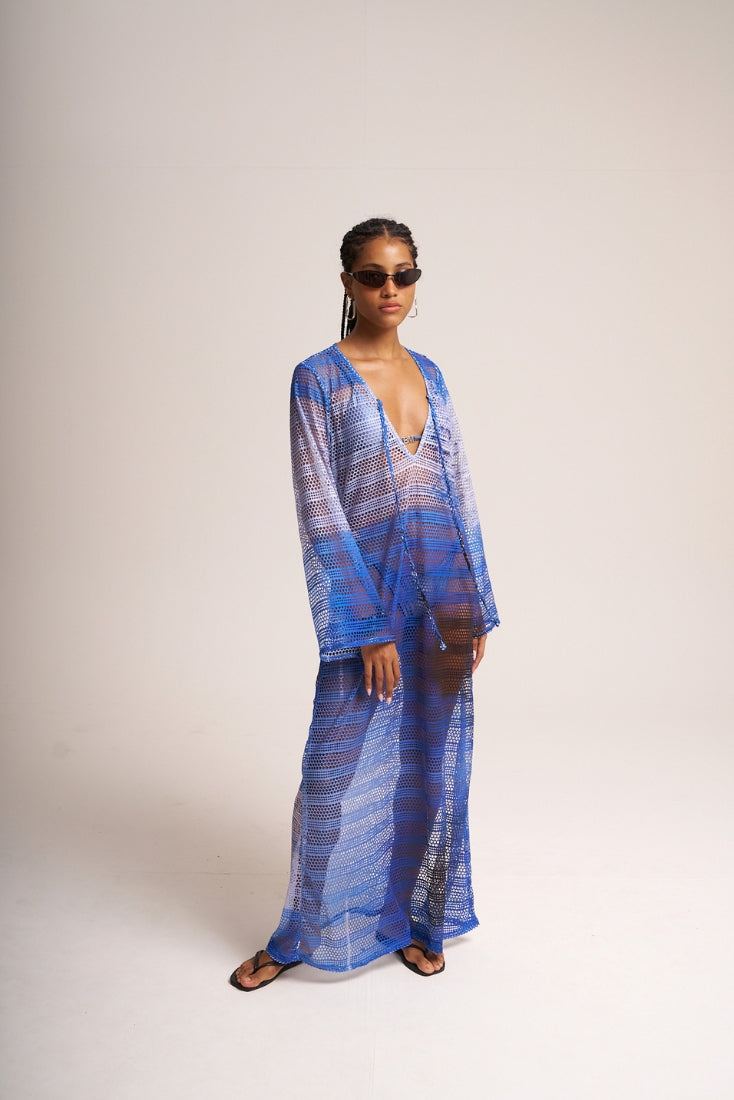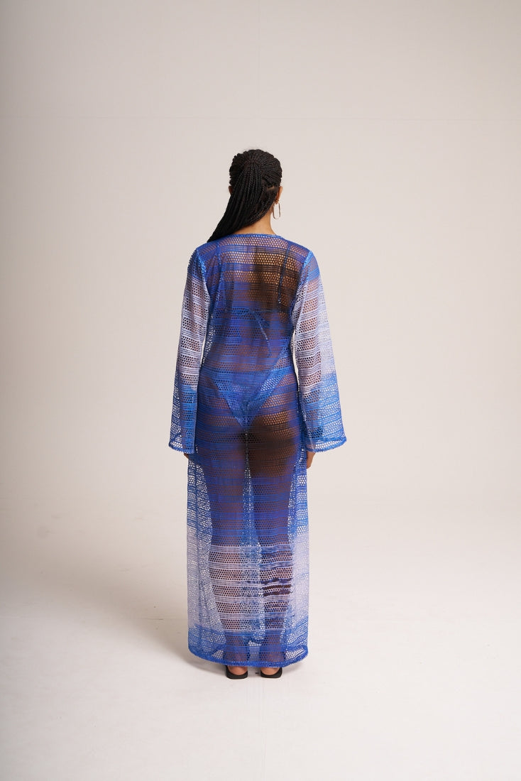 Long mesh coverup with flared long sleeves and deep V-neck on the front.
