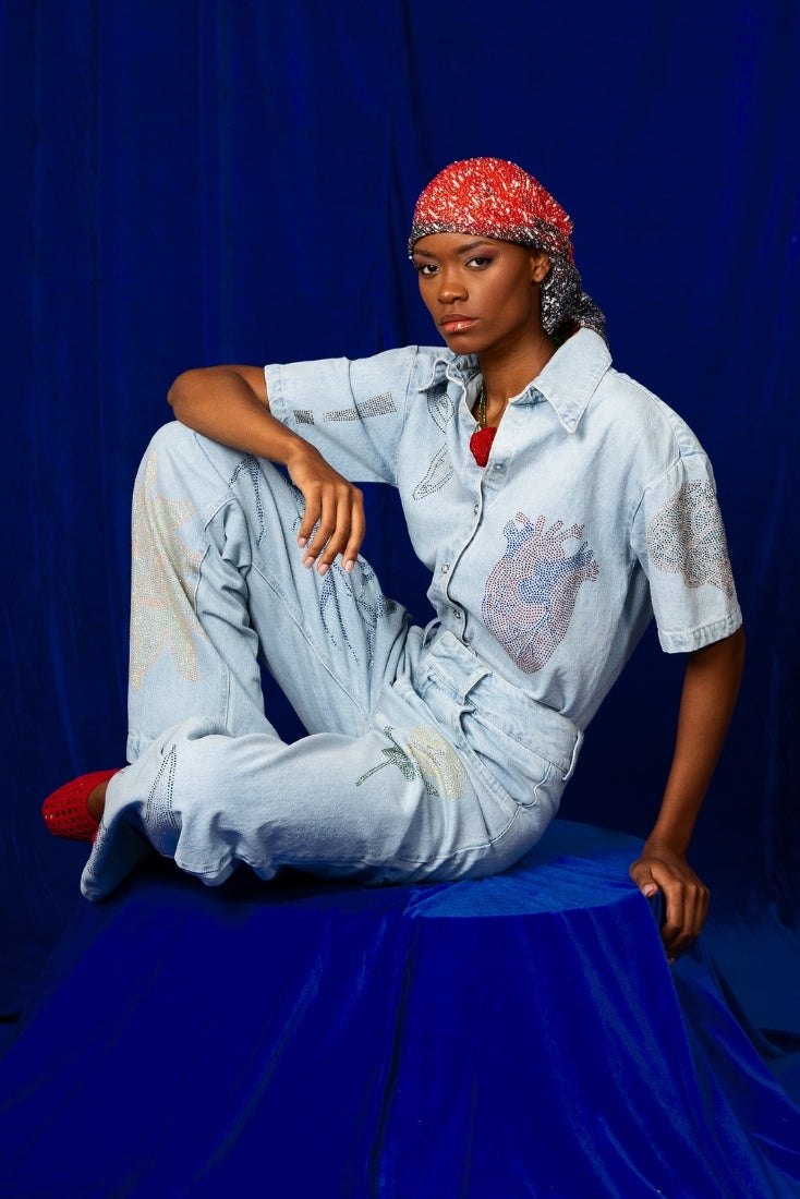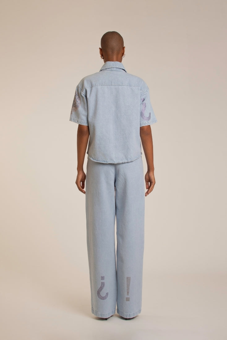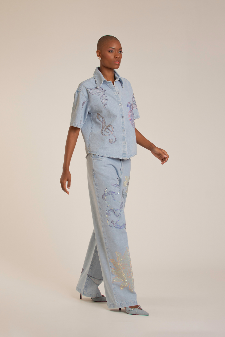 Relaxed-fit shirt with classic collar. Features crystal-illustrated details.
